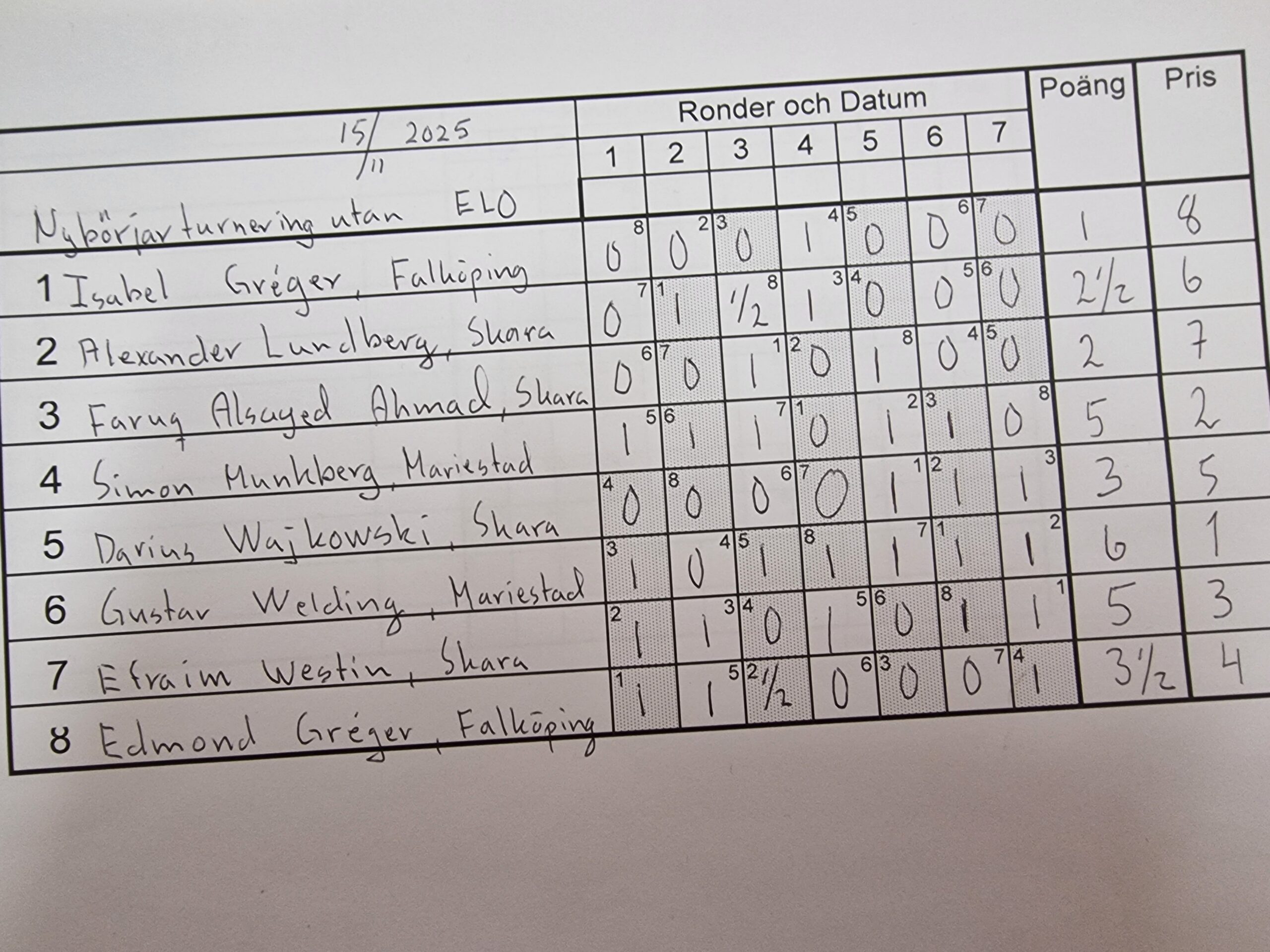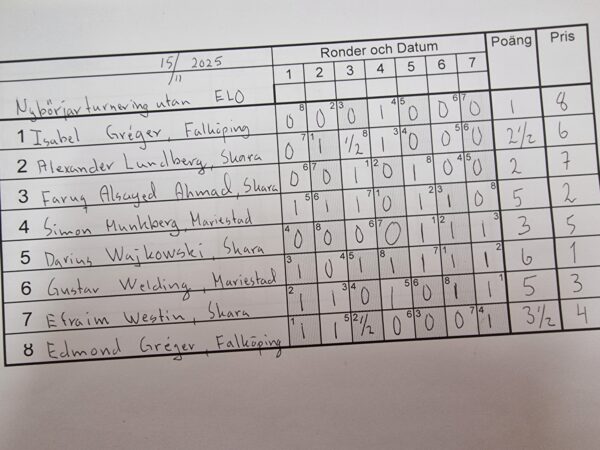 Bilder/ResultatNybörjartävling i Skara 15 november 2025 - av Josef Håkanson Idag spelades en nybörjartävling i Skara. Nedan återfinns resultat och bilder. Alla bilder är tagna av Skara SS.